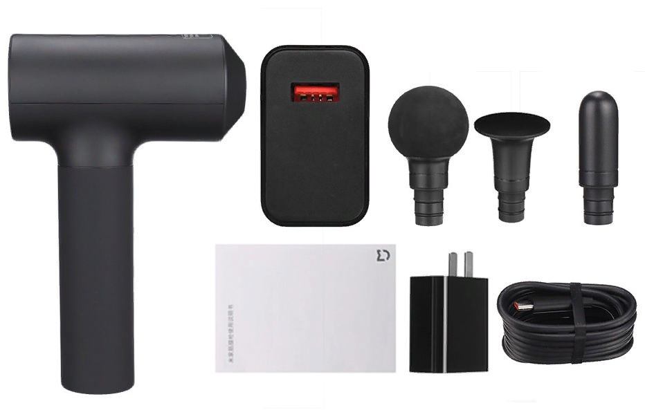 | Комплектация | Массажер, зарядный кабель USB Type-C, адаптер питания, сменные насадки 3 шт (круглая головка, плоская головка, насадка-пуля), кейс для хранения, документация |