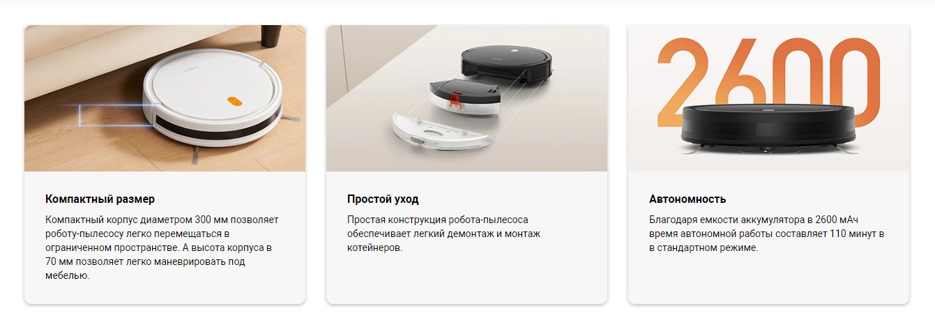 | Другие функции и возможности | голосовое управление, автоматическое возвращение на зарядную станцию, голосовое управление через ассистентов |